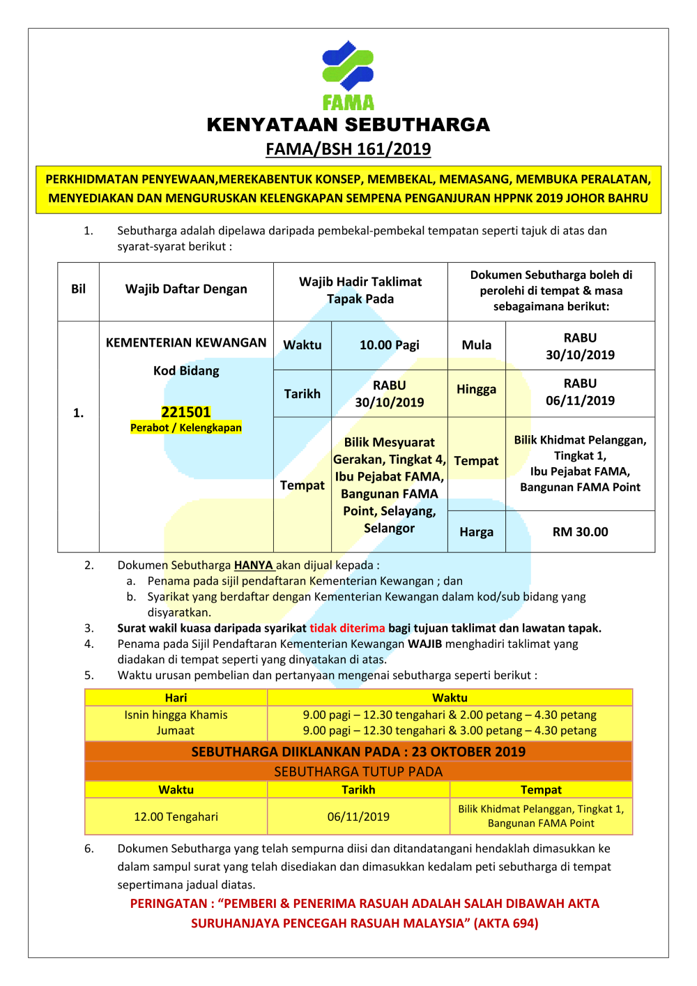 Sebutharga adalah dipelawa daripada pembekal-pembekal tempatan seperti tajuk di atas dan syarat-syarat berikut. 102 Jika ada sebarang keraguan tentang kualiti pihak Agensi boleh berhubung. NONO SEBUTHARGAPENGKHUSUSAN GRED KOD BIDANGTARIKH TUTUPTAJUKLAMPIRAN1MPBP201939G1 B04TUTUPKERJA-KERJA MEMBAIKI.